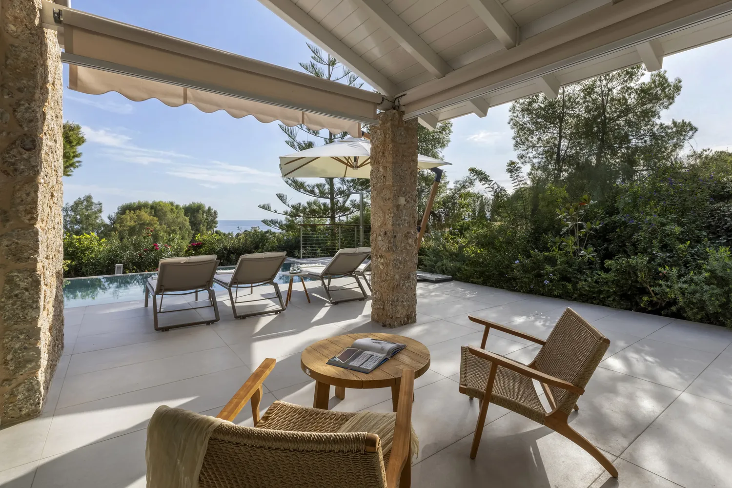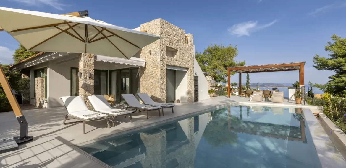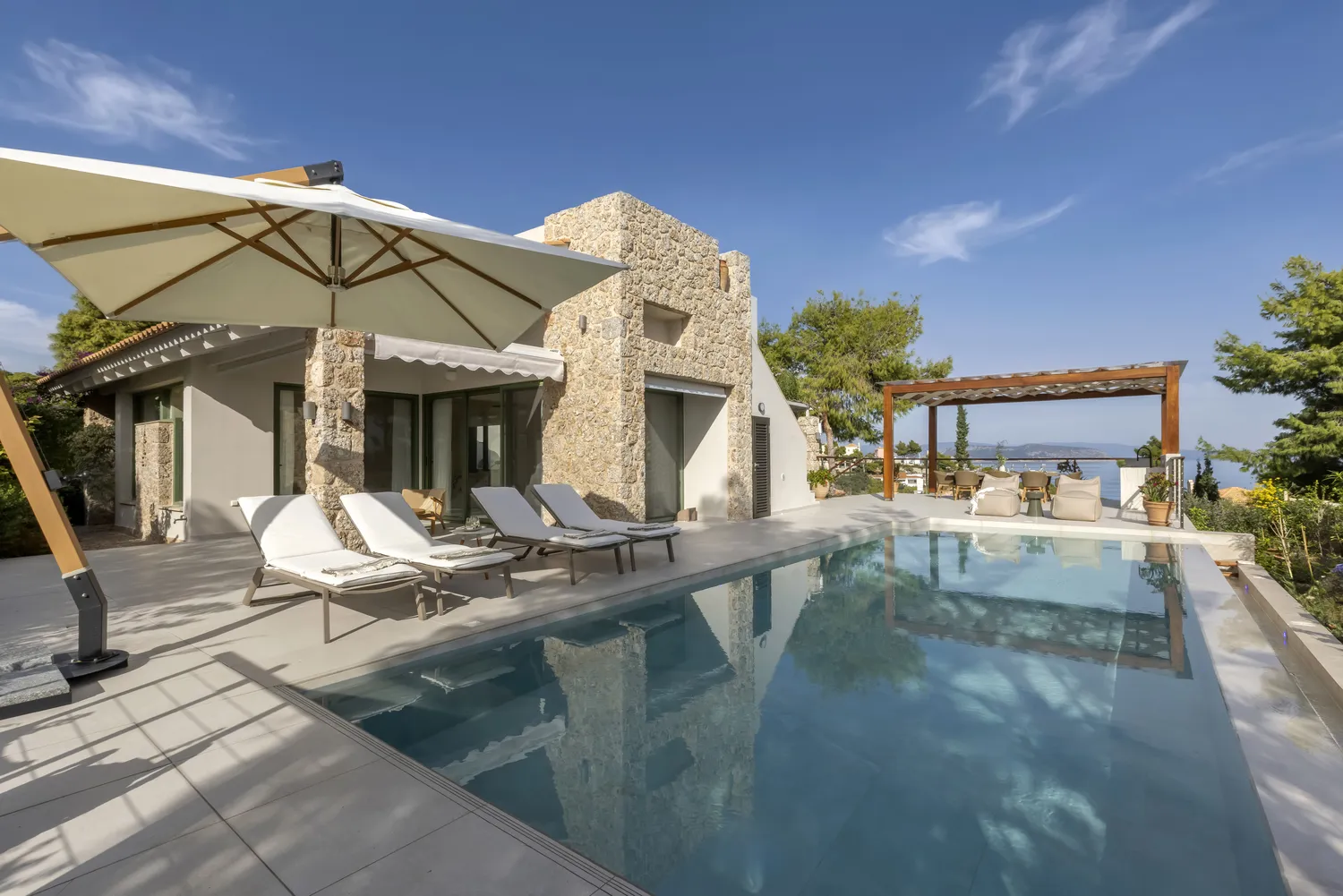 What makes Villa Levantina truly unique is the uninterrupted sea view that frames the residence. Whether you’re sipping morning coffee, relaxing in the living room, or enjoying the outdoor spaces, the Aegean is always within sight.