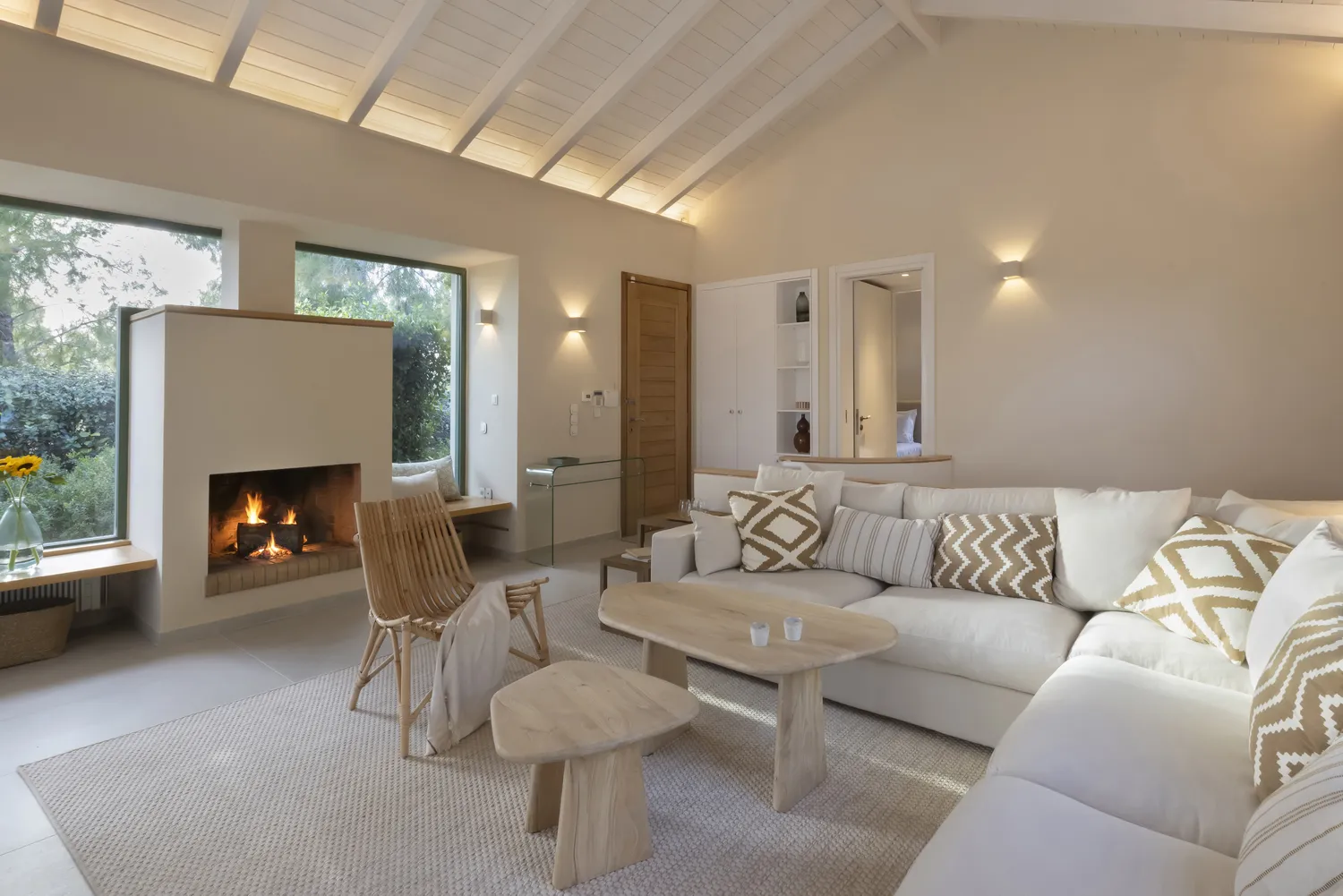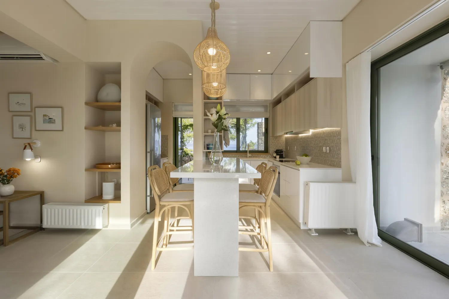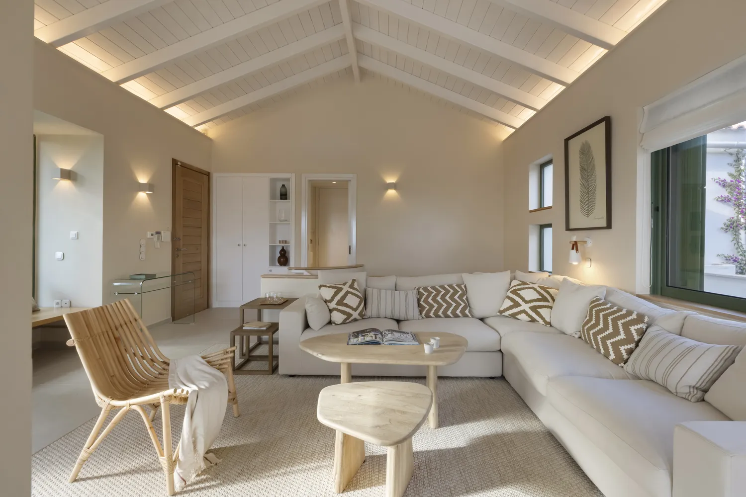 Villa Levantina features two elegant living rooms, one on each level, beautifully designed to provide comfort, privacy and flexibility for families and groups. With soft natural tones, premium furnishings and a seamless indoor–outdoor flow, both living spaces invite you to unwind, connect and fully experience the tranquility of Aghios Aimilianos.